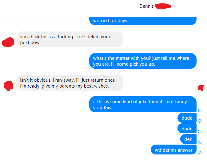 The next day, I decided to convince Dennis one more time to return home and found out that I had been blocked from his account. I told his parents about it, and they told me that Dennis did the same thing to them. I was surprised that he would even do this to his own parents.